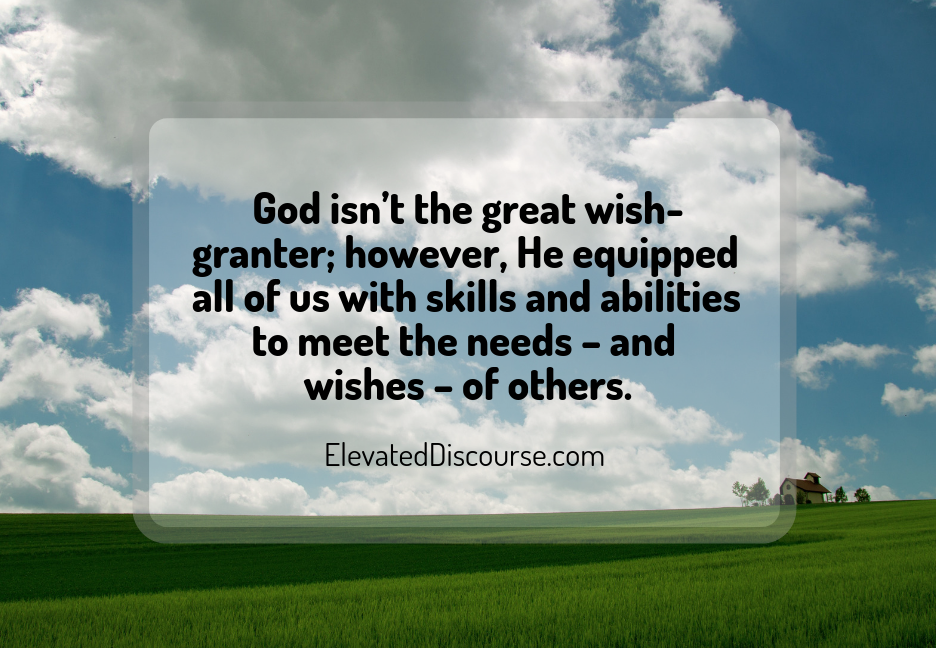 When we pray, it is natural to pray for things that directly affect our own lives – our health, our families, our friends, even our communities. But if we are honest with ourselves, when was the last time we prayed for someone whose benefit did not directly or indirectly help us too? In 1 John, it says, “But if anyone has the world's goods and sees his brother in need, yet closes his heart against him, how does God's love abide in him?” God isn’t the great wish-granter; however, He equipped all of us with skills and abilities to meet the needs – and wishes – of others. Today, seek out needs and wishes of those around you that you can meet in Jesus’ name.